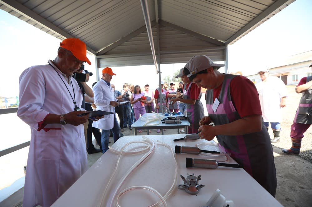 После сборки доильного аппарата конкурсантки перешли к доению коров. Здесь были важны не только скорость, но и правильность действий. В завершение испытаний судьи проверили качество и чистоту молока.