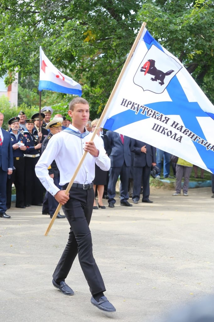 Следуя морским традициям, церемония открытия навигацкой школы началась с парада. Торжественным маршем курсанты прошли мимо собравшихся на праздник членов правительства Иркутской области, ветеранов флота, преподавателей техникума, родителей. Во главе строя они пронесли знамя навигацкой школы, оформленное в виде Андреевского флага – исторического символа Военно-морского флота.