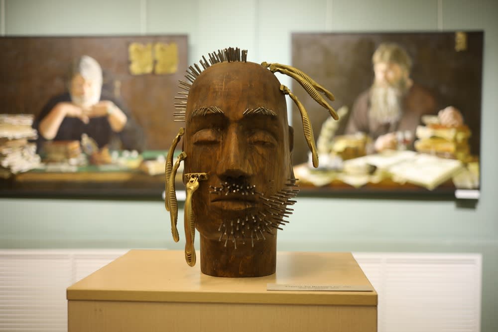 Обращают на себя внимание новые деревянные скульптуры Льва Серикова. Особенно необычно выглядит работа «Инквизиция», которая представляет собой голову мужчины, в бороду и шевелюру которого впилось шесть бритвенных станков. Есть на выставке и более привычные произведения этого автора – фигура «Казимира Малевича» из серии «Большие художники» и лиричная композиция «Лунная соната». Дизайнер Владимир Соколов в соавторстве с Евгением Штанко и Сергеем Павловцом представили сразу несколько арт-объектов: столик для фуршета «Мясорубка» по мотивам повести братьев Стругацких «Пикник на обочине», бриколаж с патефоном «СССР» и «Дозатор». Веселым акцентом на выставке стал керамический водолаз Георгия Борисова.