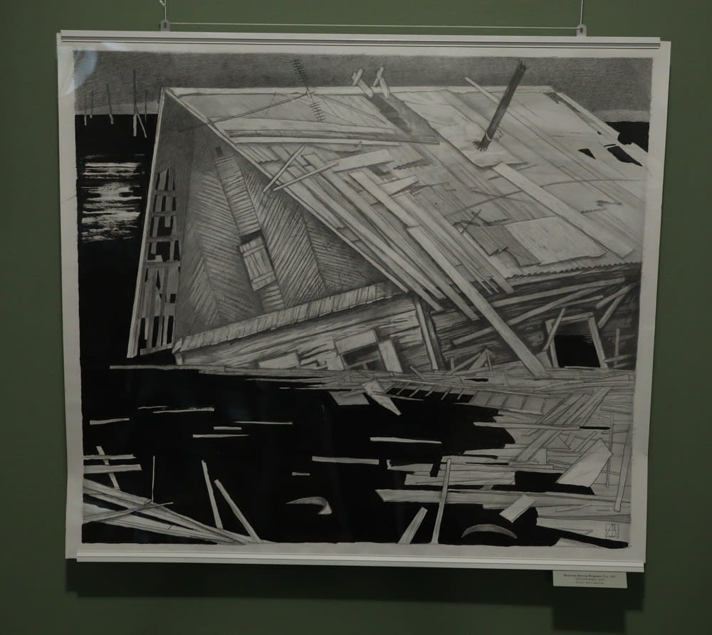 Интересно, что иркутские графики уже успели среагировать на наводнение в Тулуне. Сразу два художника представили на выставке работы, посвященные этой трагедии. Виктор Полетаев создал произведение «Черная вода», а Анастасия Свинарева назвала свой графический лист «После наводнения».