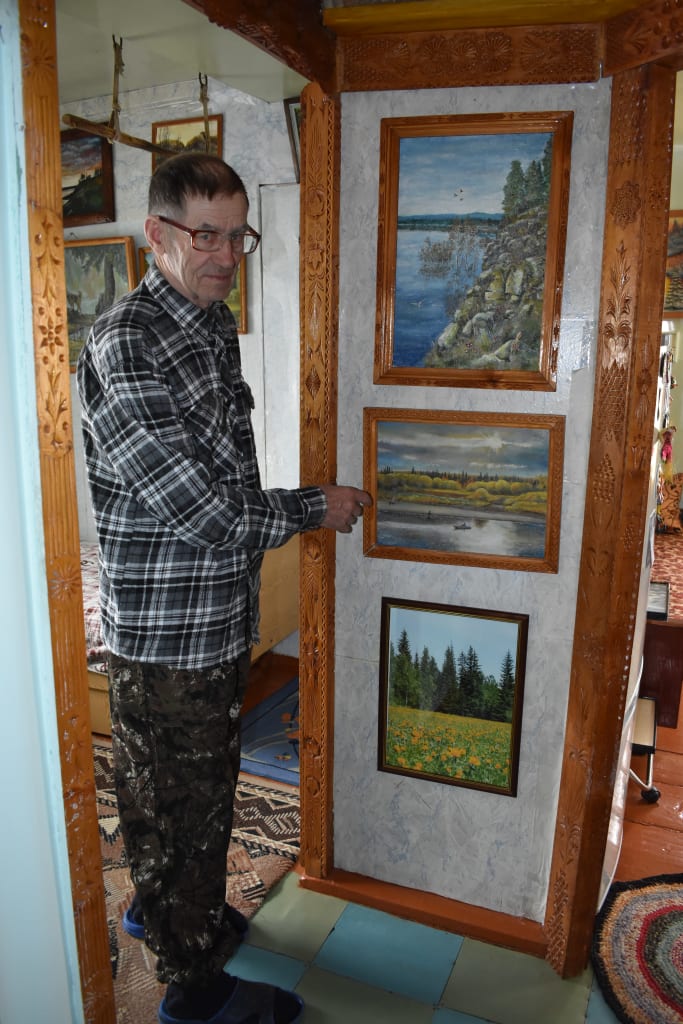 Зайдешь внутрь – настоящая художественная галерея со множеством картин и фотографий в резных деревянных рамах. О каждой Константин Иванович может целую историю припомнить. На этой изобразил, как однажды увидел пришедших на водопой ранним утром северных оленей, ниже – запавшее в душу поле ярких жарков на фоне разлапистых елей. Это любимый Дик, а рядом они с женой и внучатами на прогулке в лесу.