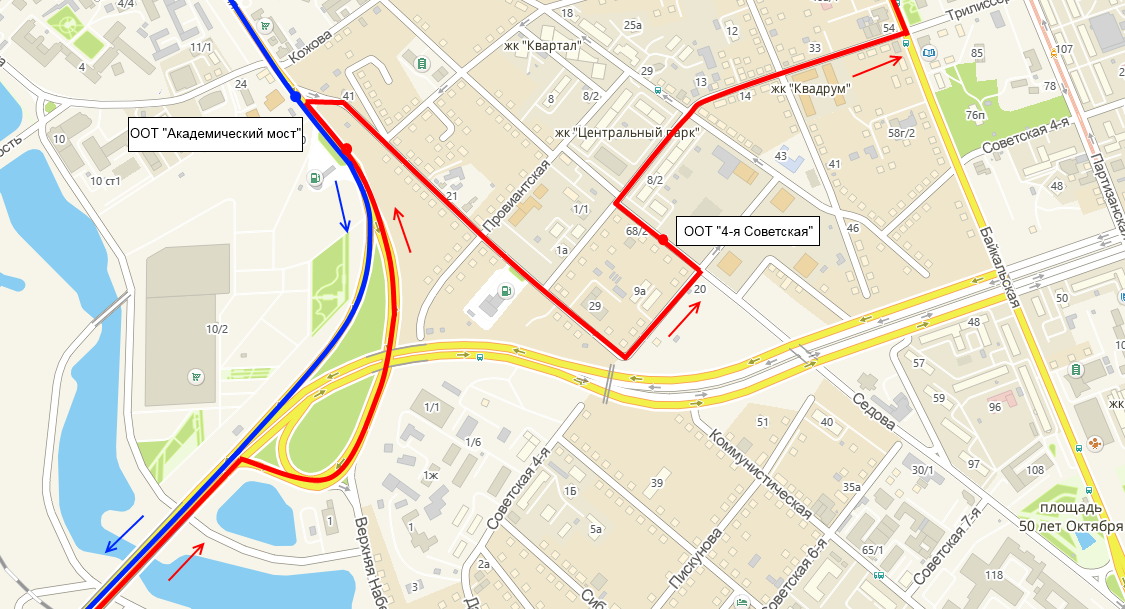 При движении из м/р Университетский к Центральному рынку после Академического моста движение будет осуществляться по улицам 3-го Июля, Коммунистической, 4-ой Советской, Седова и далее по маршруту.