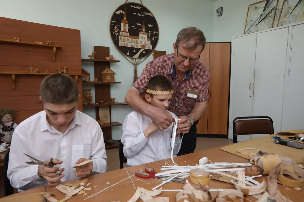 Чудеса творчества демонстрируют и мальчишки в берестяной мастерской школы-интерната. В ней ребята изготавливают самые разные поделки из бересты. Волосы 15-летнего Сережи украшает повязка из этого приятного податливого материала. Ее мальчик сделал собственными руками. Сейчас он занят чем-то другим, но, оставляя работу, спешит подарить еще одну свою работу губернатору – ангела в телогрейке, сделанного из глины. При создании сувенира использовалась муфельная печь. Есть в интернате и гончарный круг. По словам министра социального развития, опеки и попечительства региона Владимира Родионова, уже многие соцучреждения приобрели такое оборудование для творческой работы с глиной.