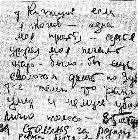 Тов. Кузнецов, если я погиб, одна моя просьба – семья. Другая моя печаль – надо было бы еще сволочам дать по зубам, т.е. жалею, что рано умер и фашистов убил лично только 84 (зачеркнуто) 85 штук. За Сталина, за Родину, ребята, бейте врагов!!!»
