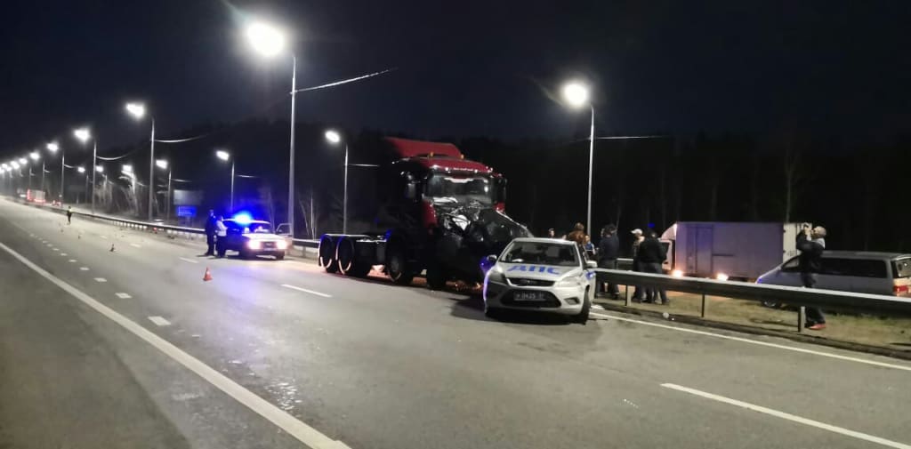 ДТП произошло в понедельник около 20:00. Прибывшие на место происшествия сотрудники ДПС проверяли информацию о пострадавших. В этот момент в позади стоящий автомобиль врезался грузовик Scania. От удара Mitsubishi отбросило на патрульную машину.