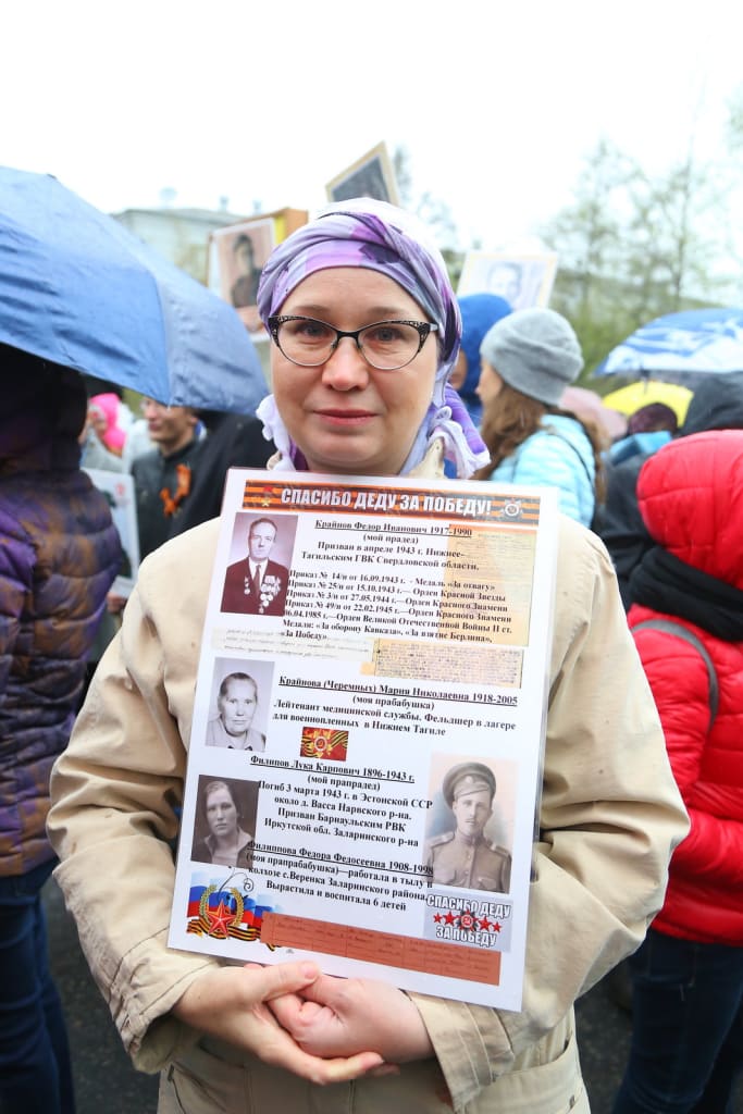 В руках у иркутянки Любови Крайновой довольно нестандартный плакат. Изготовили его раньше, чем колонны «Бессмертного полка» прошли в первый раз по улицам городов страны. Тогда никто не знал параметров штендеров, да и в целом формат акции был непривычен. Заламинированная бумага с четырьмя портретами сделана для маленькой дочки, которой сейчас уже 11 лет.