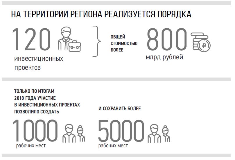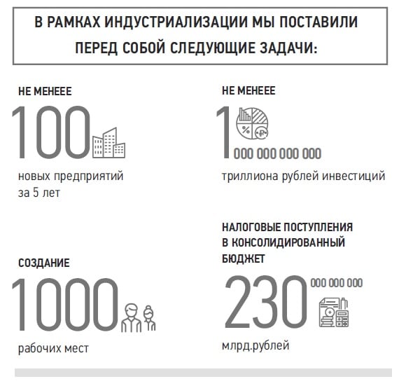 В рамках индустриализации планируется создать не менее 100 новых предприятий, вложить не менее 1 трлн рублей инвестиций, создать 16 тыс. новых рабочих мест. В результате налоговые поступления в консолидированный бюджет региона возрастут до 250 млрд рублей.