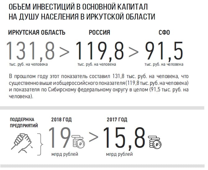 Одним из важнейших результатов является рост инвестиций в основной капитал, который превысил 314 млрд рублей. По этому показателю Иркутская область занимает второе место в Сибирском федеральном округе. Это говорит о высоком доверии бизнеса к региональной власти и благоприятной оценке перспектив нашей экономики.