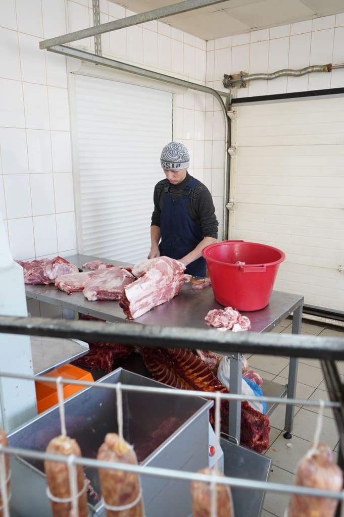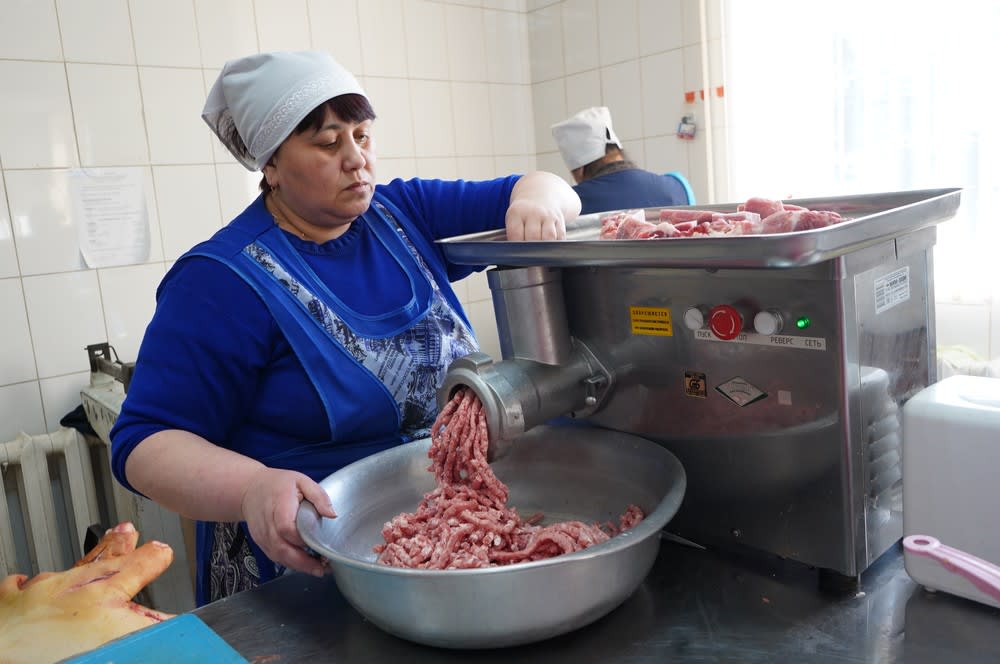 Новый мясоперерабатывающий цех в Тулуне был построен с нуля. Сегодня он оснащен современным оборудованием – здесь есть пила для разделки туш, мясорубка, фаршемешалка, тестораскаточная машина, тестомес, мукосей, вакуумный шприц для набивки колбас.