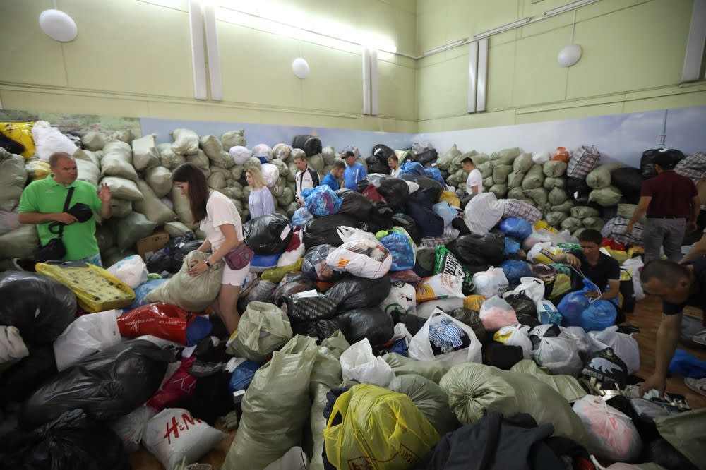 «Девочки, у кого детские вещи, давайте сюда. Помогите мне мешок подержать. А я женское собираю, кому попадется, давайте мне», – то и дело раздается в кругу добровольцев. Среди них две иркутянки – Юлия и Елена. В субботу они привезли продукты, в воскресенье – вещи, и решили остаться помочь с сортировкой.