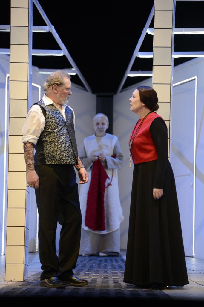 Еще один яркий персонаж в спектакле – нянька Федосья (Людмила Попкова), которая говорит будто невпопад, но всегда в точку. Жуткий грим, белые одежды, красное вязание в руках – все это делает ее фигуру мистической, напоминающей одновременно одну из богинь судьбы или проводницу в мир мертвых.