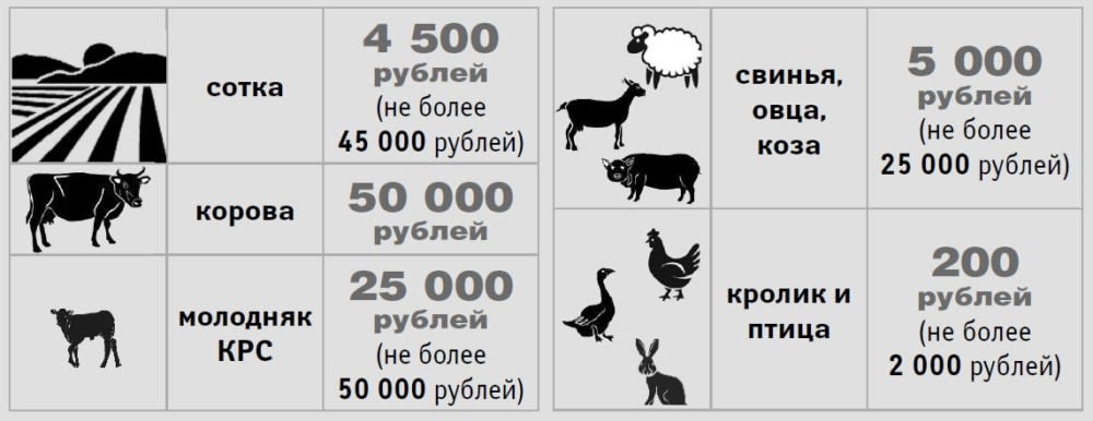 - Указ губернатора: определены размеры компенсаций вследствие гибели посевов сельскохозяйственных культур, многолетних насаждений, а также сельскохозяйственных животных и птиц из расчета 4500 рублей на 1 сотку, но не более 45 тыс. рублей; 50 000 рублей за 1 корову; 25 000 рублей за утрату молодняка КРС, но не более 50 000 рублей; за утрату свиней, овец, коз – 5000 рублей, но не более 25 000 рублей; 200 рублей за кроликов и птиц, но не более 2000 рублей.