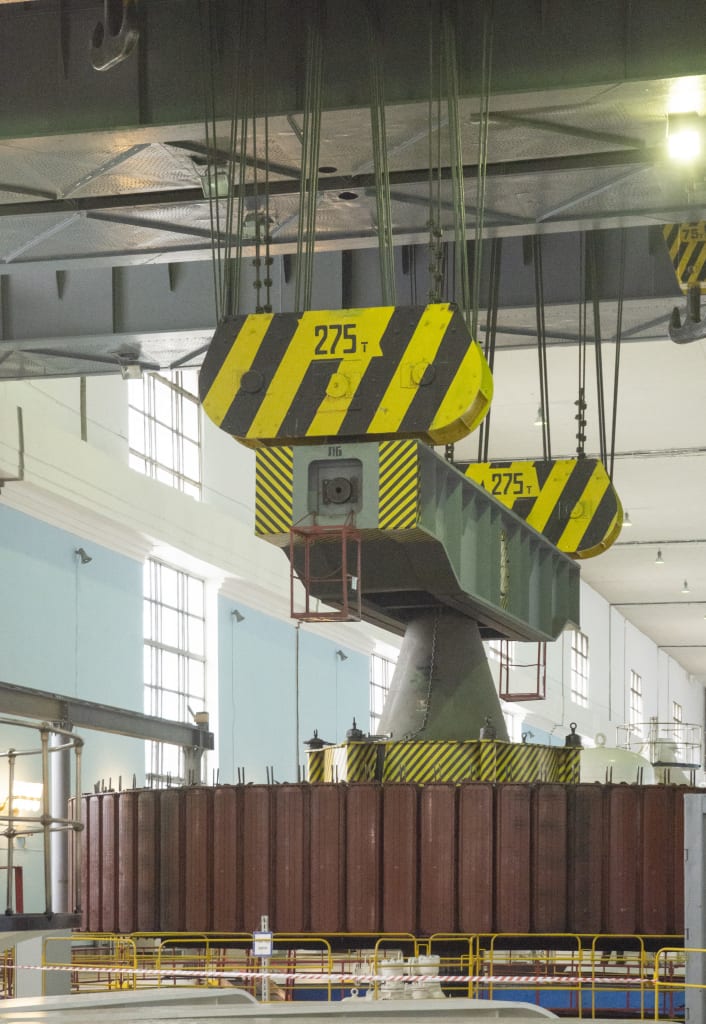 Подготовительные работы по демонтажу гидроагрегата начались еще в 2018 году. В настоящее время разобраны маслоприемник, опора, нижняя крестовина, перекрытия. 12 июля была произведена выемка самой габаритной и тяжелой детали оборудования – ротора (вращающей части гидрогенератора, которым создается магнитное поле для последующего преобразования электроэнергии). Весит он более 500 тонн, поэтому для переноса ротора на специальную площадку потребовалось два тихоходных крана грузоподъемностью 275 тонн каждый. Присутствовавших на столь знаковом событии журналистов впечатлила профессиональная работа крановщиков, которые довольно быстро переместили огромный груз, ювелирно обходя работающее оборудование.