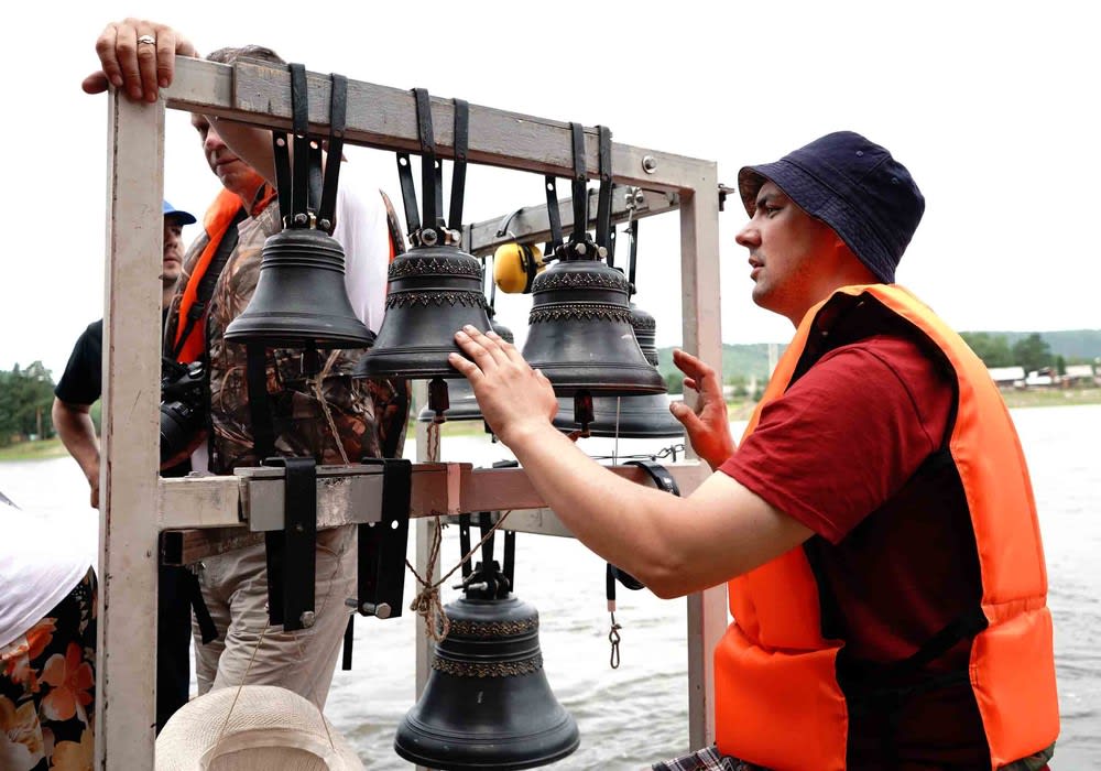 Звонари плывут по Иркуту и Ангаре под звон колоколов передвижной звонницы, которая располагается на 7-метровом катамаране.