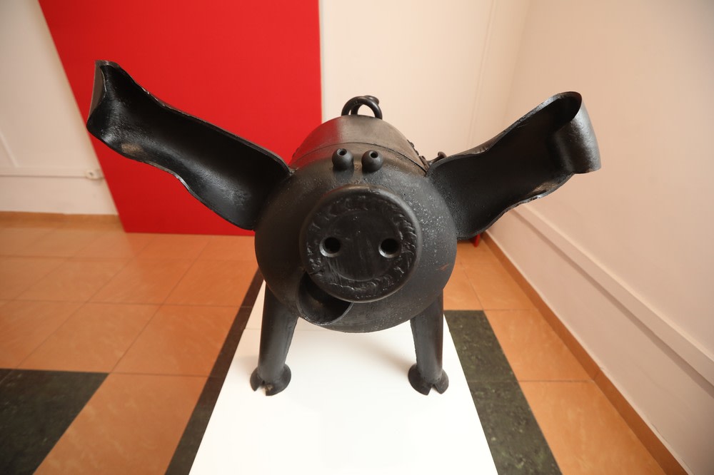 Кстати, на выставке есть и живые цветы, ведь многие скульптуры Дмитрия Осипова имеют вполне практическое назначение. Например, «Цветонос», «Папуас» и «Рикша» – это оригинальные клумбы, заполненные фиалками. «Коза», поросенок «Наф-наф» – удобные и красивые мангалы. А работа «Фотограф» или многофигурная композиция «Каюр» с очаровательными собачками – роскошные светильники.