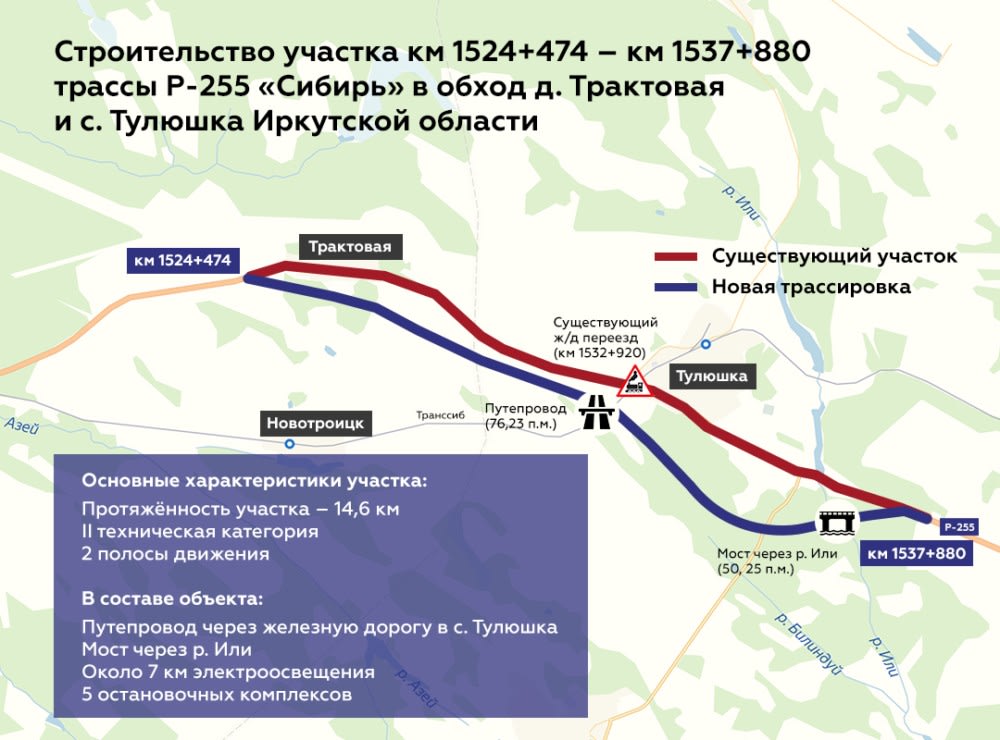 В августе подрядная организация приступит к выполнению подготовительных работ к строительству на участке трассы «Сибирь» в границах Тулунского и Куйтунского районов км 1524+474 – км 1537+880. На новом участке трассы Р-255 «Сибирь» будет обеспечено скоростное движение за счет трассировки в обход населённых пунктов и строительства путепровода над Транссибирской железнодорожной магистралью.