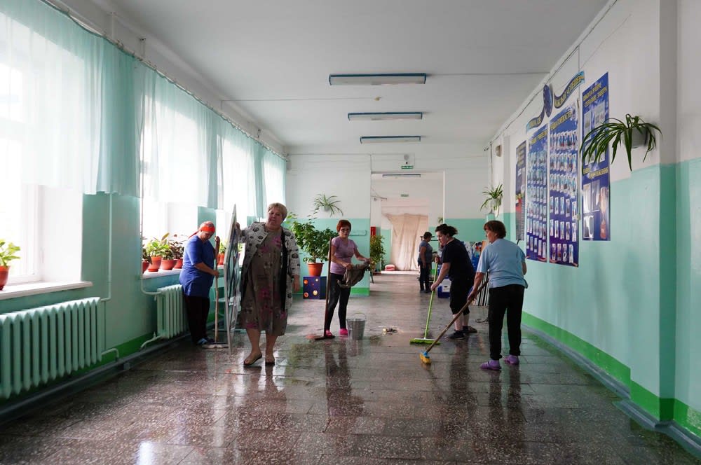 Спустя всего месяц после наводнения от разгулявшейся стихии практически не осталось никаких следов. Только по оштукатуренным стенам можно определить, на какую высоту здесь поднималась вода. Рабочие трудятся в штатном режиме: меняют деревянные окна на пластиковые, перестилают полы, кладут в рекреациях плитку, а в коридорах стелют линолеум. Ремонт на втором этаже полностью завершен.