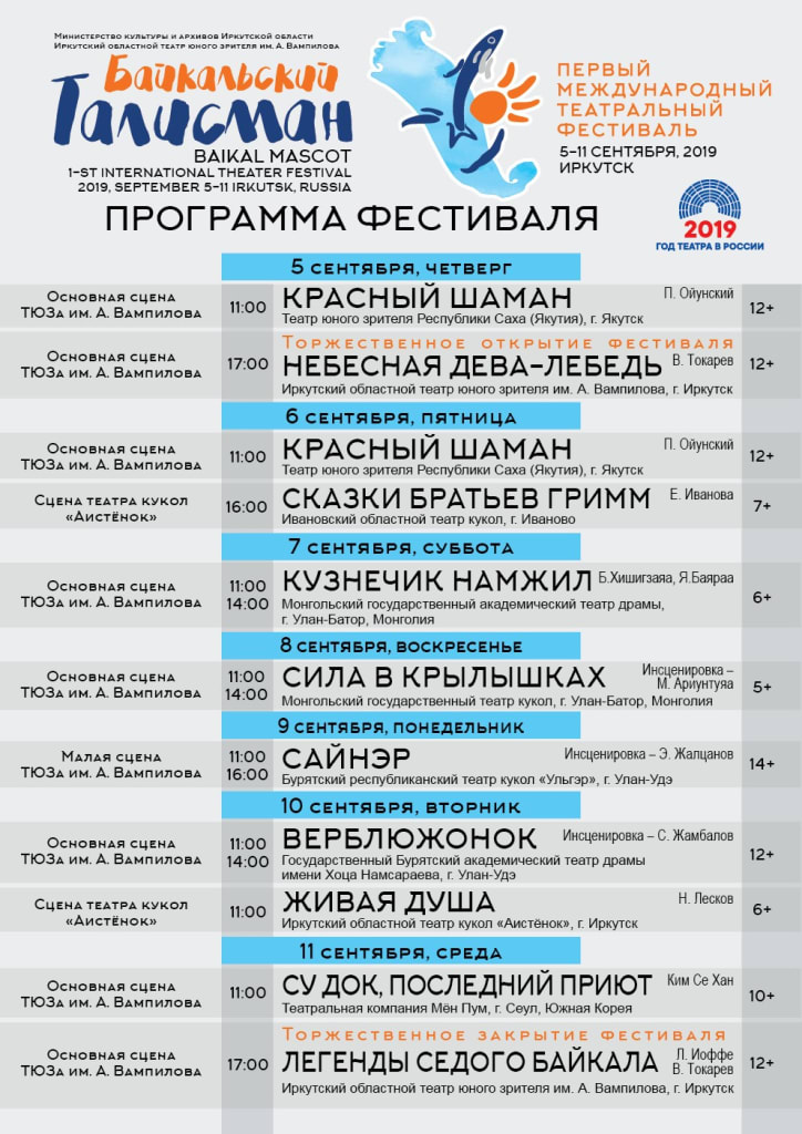 Театры Кореи и Монголии примут участие в Первом Международном театральном фестивале «Байкальский талисман», который пройдет с 5 по 11 сентября 2019 года на сцене Иркутского ТЮЗа им. А. Вампилова. Об этом 26 августа 2019 года сообщили в пресс-службе театра.