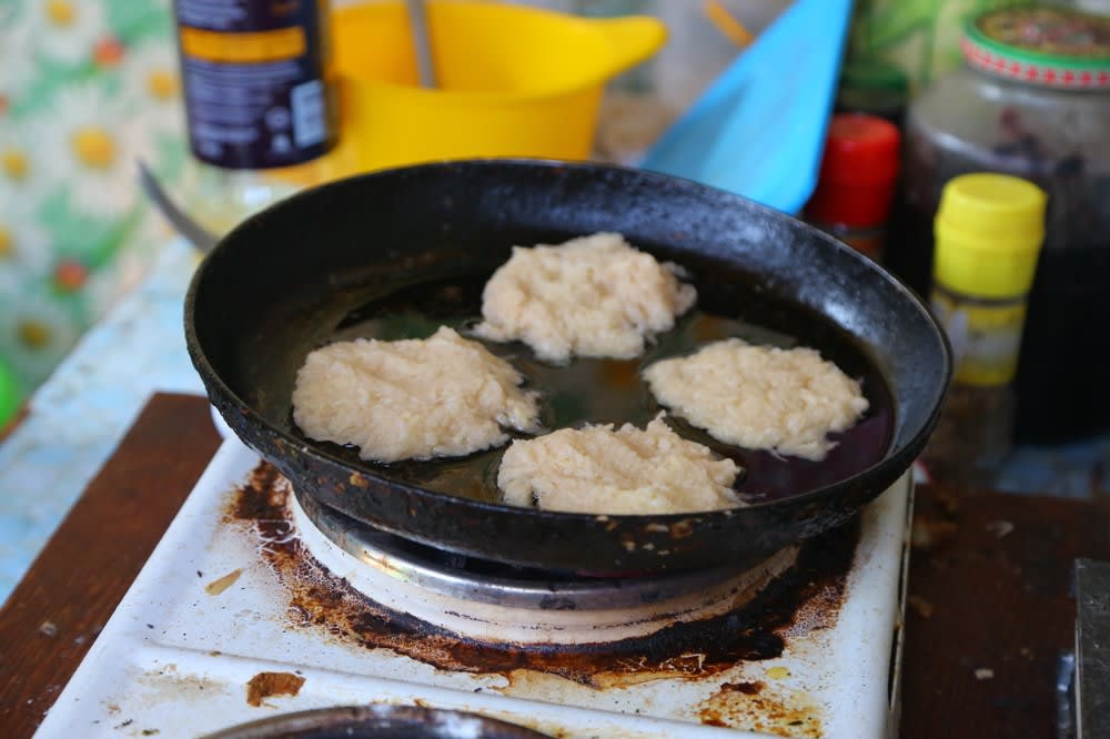 Затем она отживает лишнюю жидкость, формирует картофельные оладьи и опускает их в шипящее масло. После чего обжаривает драники с двух сторон до золотистой корочки. Прямо на глазах картофельные оладьи без единой добавки делаются выпуклыми, легкими, воздушными. И абсолютно не разваливаются без добавления яйца, как это не удивительно.