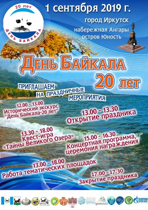 В воскресенье, 1 сентября, на бульваре Гагарина и острове Юность в Иркутске состоится празднование «Дня Байкала». В течение 6 часов будут развернуты тематические площадки, организована квест-игра, пройдет церемония награждения активных участников мероприятий по сохранению и защите Байкала. Об этом 30 августа 2019 года сообщили в пресс-службе правительства Иркутской области.