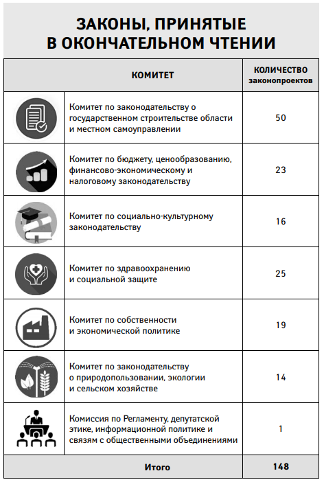 – Год был весьма непростым, и вместе с тем продуктивным. Депутаты не отступили от своей принципиальной позиции – не допускать экономии в социальной сфере. Мы приняли социально-ориентированный бюджет области и ряд законов, направленных на поддержку жителей области. Важным был закон об увеличении на размер НДФЛ стипендий и студентам-целевикам. Еще одним достижением считаю увеличение расходов по областной программе «Развитие здравоохранения» на 2019–2024 годы, которого удалось добиться после ряда довольно напряженных дискуссий. Серьезно поработали над межбюджетными отношениями и увеличили помощь территориям из региональной казны. Депутаты плотно занялись вопросами совершенствования системы здравоохранения, поощрения добровольцев и предоставления им помощи, реализации проекта «Народные инициативы», ремонта дорог. Планов на предстоящий сезон у нас много, поэтому он будет не менее насыщенным и горячим, – кратко подвел итоги первого года работы спикер областного парламента Сергей Сокол.