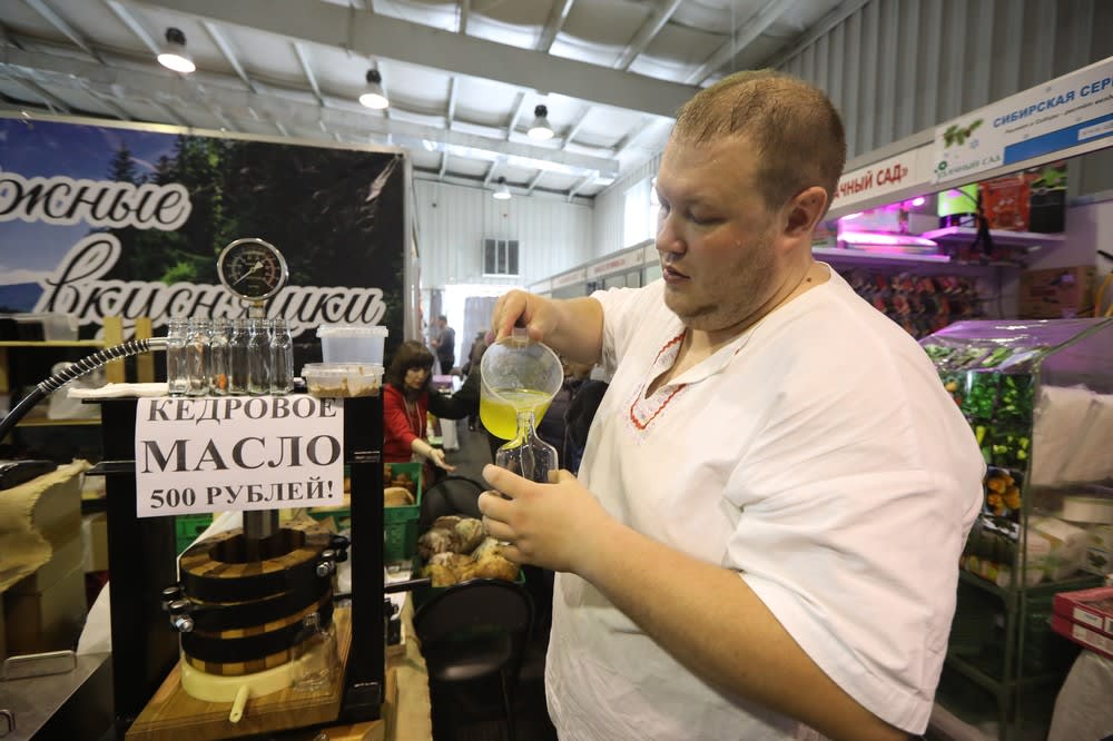 – Подходите, пожалуйста, к нам! Попробуйте кедровое масло, варенье из сосновых шишек, бездрожжевой хлеб на опаре! – зазывает посетителей руководитель иркутского сельхозкооператива «Таежные вкусняшки» Денис Клементьев.