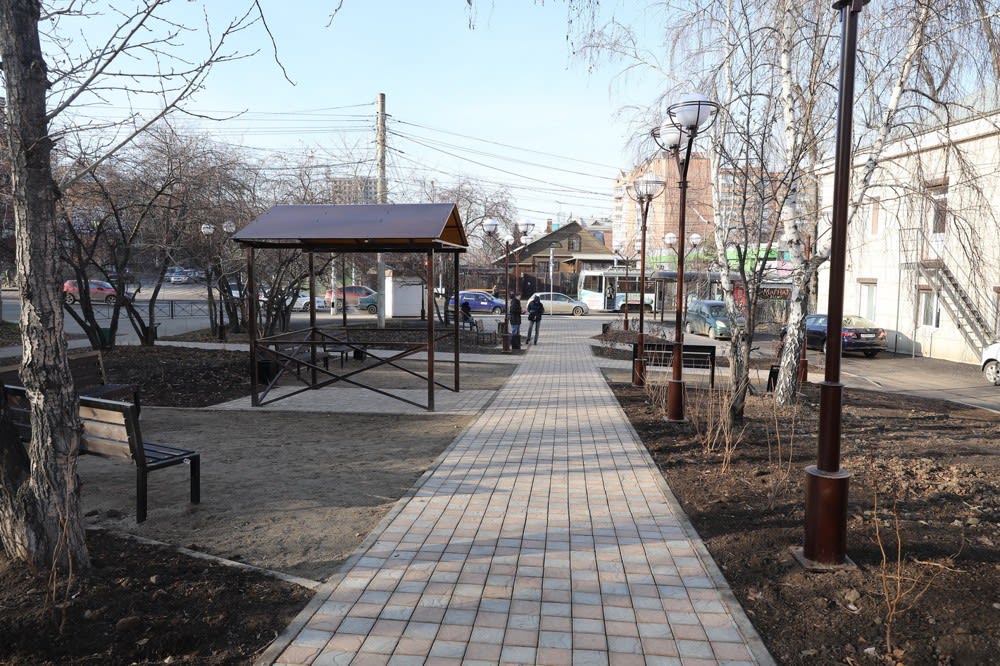 Председатель думы Иркутска Игорь Ружников показал Сергею Соколу один из скверов, который удалось создать на пересечении улиц Депутатской и Пискунова. Раньше здесь был пустырь, а теперь благоустроенная территория – с фонарями, скамейками, урнами, пешеходными дорожками из тротуарной плитки.