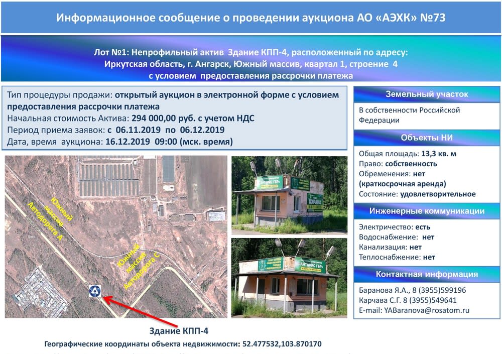 Ссылки: http://www.a-k-d.ru/tender/74284, http://atomproperty.ru/prodazha-neprofilnykh-aktivov/,