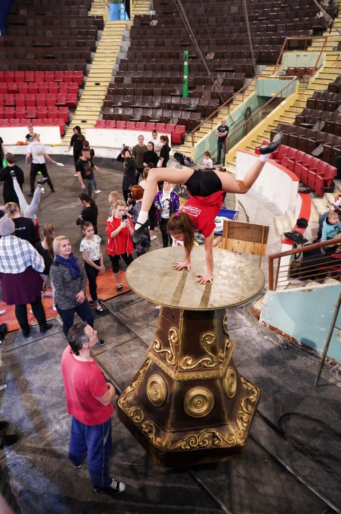 Вика Слободчикова из иркутской цирковой студии «Иллюзия» мечтает стать профессиональной артисткой цирка. На мастер-классе продемонстрировала базовые стойки и шпагат. Трюки выполняла на высокой крутящейся конструкции.