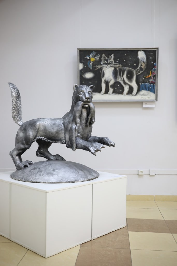 Есть на выставке и более реалистичные изображения котов. Среди них скульптура художника Сергея Яптуева «Пора», кот на картине Регины Присяжниковой «Гость», а также в работах Андрея Шпирко «Цезарь», «В лунную ночь». Кстати, в окнах Музейной студии также можно увидеть красивые и забавные изображения котов. Это работы победителей городского конкурса детского рисунка «Хвостатый, полосатый». Выставка будет работать до 19 декабря, за это время организаторы обещают провести для посетителей квесты, мастер-классы и мастер-шоу.