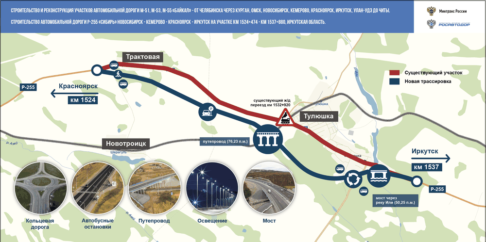 На 2020 год запланировано проектирование капитального ремонта участка трассы Р-255 «Сибирь» км 1491 + 320 – км 1493 + 430. Необходимо поднять насыпь в Тулуне, учитывая уровень воды во время паводков. Разработка проекта займет около года. После можно будет говорить о стоимости и сроках работ. Кроме того, планируется скорректировать начатый в прошлом году проект строительства автодороги Р-255 в обход Тулуна.