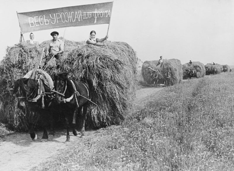 – Что за техника у нас была в войну? Зерновые убирали жаткой. В нее запрягались четыре лошади. На первой паре сидит парнишка – «гусак» мы его называли, лошадьми управляет. Вот я тем «гусаком» и был. Жатка жнет – у нее пять крыльев, косит хлеб, скидывает такое количество колосьев, из которых можно связать сноп. Женщины идут следом и вяжут эти снопы, кладут их в суслоны (своеобразные шалашики). 10 снопов ставят – девять в ряды укладывали, десятый наверх. И укладывали колосьями вниз, закрывали, чтоб дождем не намочило.