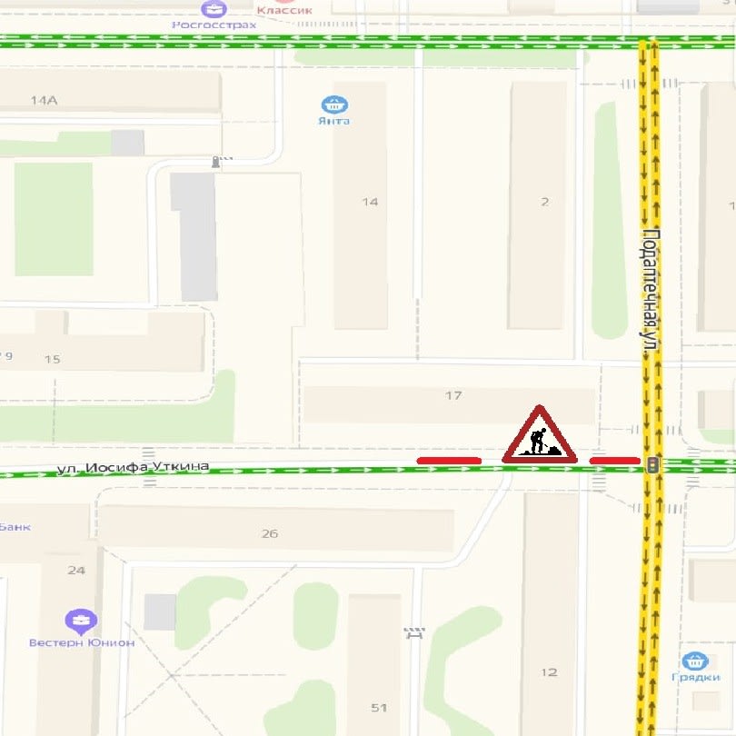 Движение перекрыли из-за земляных работ по вскрытию тепловой сети для проведения ремонтно-восстановительных работ в районе дома № 17 по улице Иосифа Уткина.