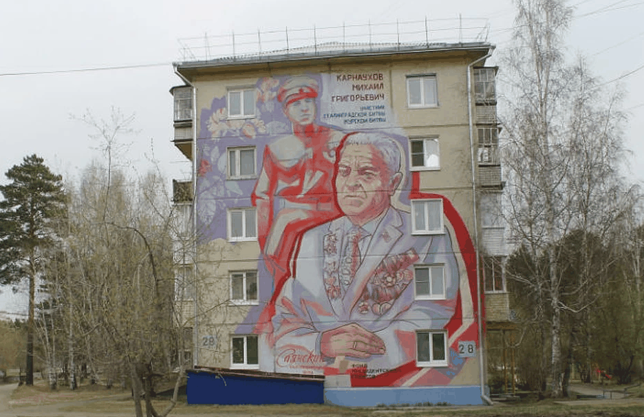 В Саянске на одном из домов, где живет фронтовик Михаил Григорьевич Карнаухов, появился его большой портрет. Ветеран изображен крупным планом – с первого по пятый этажи, в пиджаке, на котором нет свободного места от наград. А на заднем плане его фотография времен военной молодости. Портрет написан в рамках проекта «Живая история» Саянского благотворительного фонда на средства президентского гранта.