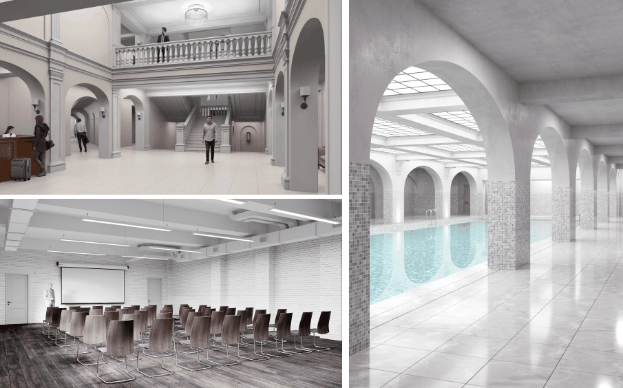 «В бане были отдельные номера, душевое отделение и малые кабинки. Во всех отделениях стояли мраморные скамьи на тяжелых чугунных ножках. Через главный вход попадали в просторный вестибюль, пол и стены которого были отделаны узорной плиткой. На потолке почти всегда горела красивая люстра, и ее световые блики играли на золоченых доспехах двух рыцарей с лампами в руках», – таким запомнили иркутяне внутреннее убранство Курбатовских бань во времена их процветания. Современные горожане застали лишь руины былой роскоши. Однако новый собственник объекта культурного наследия решил не только восстановить памятник, но и вернуть ему первоначальную функцию.
