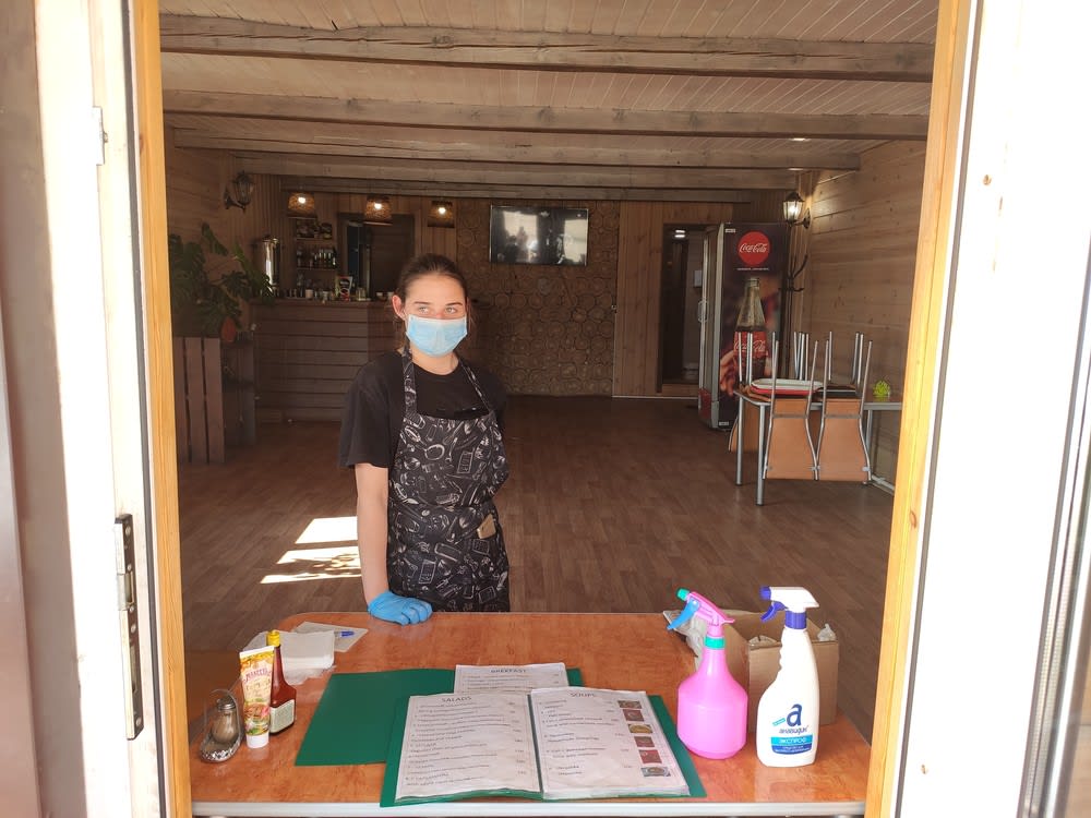 По дороге на Ольхон, где привычно останавливаются туристы, продавцы в кафе носят маски и перчатки, пользуются средствами для дезинфекции рук, на летних террасах расставлены столики.
