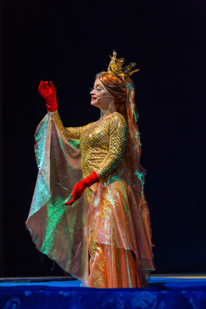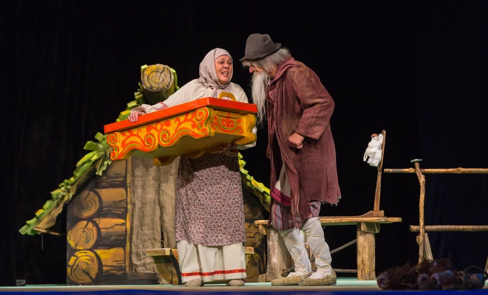 Жанр постановки неслучайно обозначен, как театральная фантасмагория, ведь его сюжет расширяет рамки сказки. Благодаря художнику спектакля Татьяне Ларевой зритель оказывается то на берегу синего моря, то в царских палатах, а то и на дне морском. Встречает его Сказительница (Людмила Попкова) в волшебном теремке. Потом она остается в истории в качестве голоса за кадром. Артисты Владимир Безродных и Марина Егорова делают сказочных Старика со Старухой живыми людьми, наполняя их образы эмоциями. За час постановки мы наблюдаем трансформацию героини из бедной женщины, которая мирно пряла пряжу и ждала дома мужа-рыбака, в настоящего монстра, разрушающего все вокруг и вещающего не своим голосом.
