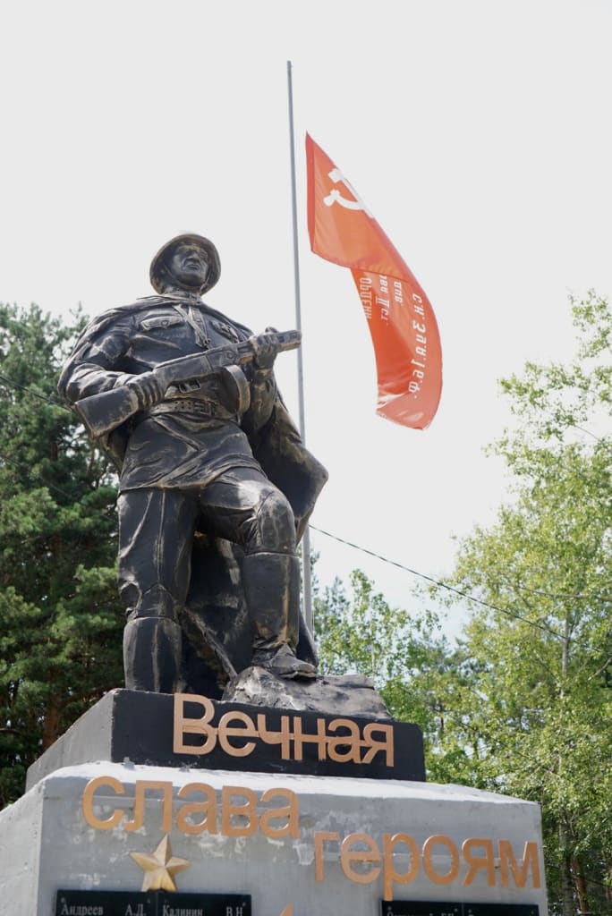 К 9 Мая парк попросил открыть единственный местный ветеран Николай Яковлевич Якунин. Над памятником полощется знамя – копия штурмового флага 150-й ордена Кутузова Идрицкой стрелковой дивизии, водруженного 1 мая 1945 года на крыше здания рейхстага в Берлине.