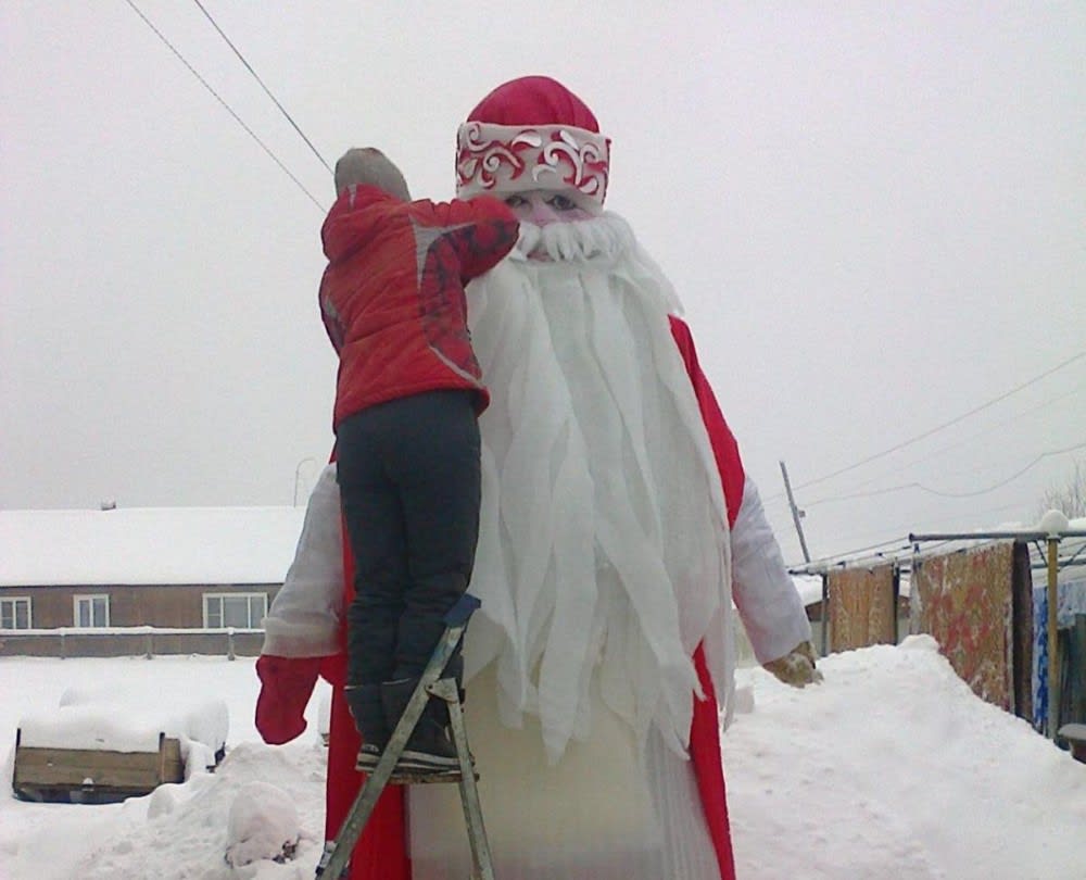 Долго он не простоял, собаки вытащили ткань, Дед Мороз подтаял и рухнул. Но первый опыт не огорчил Марию. На следующий год она решила сделать что-то попрочнее. Каркас нового трехметрового Деда Мороза набили уже поролоном и стекловатой.