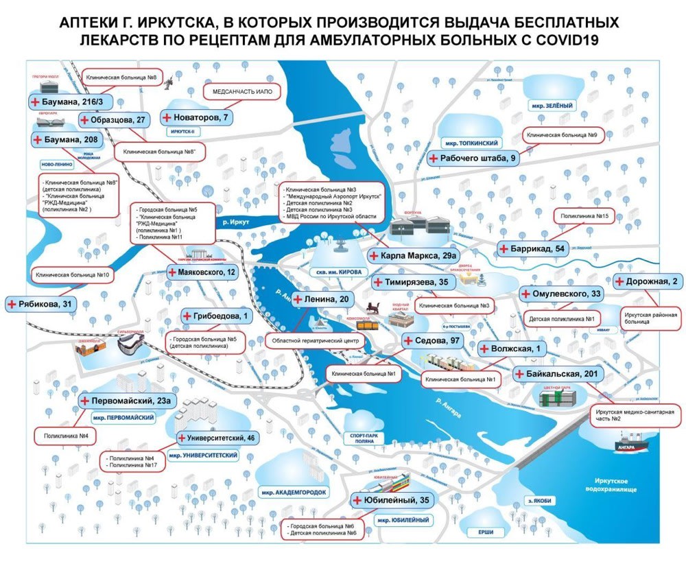 В Иркутской области составлен список из 64 аптек, которые будут выдавать бесплатные лекарства по рецепту врача для коронавирусных больных, которые лечатся на дому. Об этом 18 ноября 2020 года сообщает пресс-служба регионального правительства.