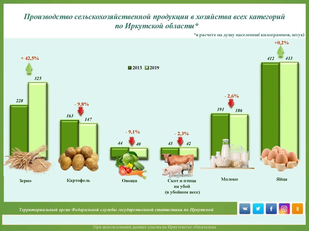 За последние 5 лет среднедушевое потребление населением Иркутской области мяса, яиц, сахара и растительного масла выросло на 1-4%, а хлебных продуктов, фруктов и ягод осталось на прежнем уровне. Меньше всего было съедено картофеля, овощей и молока, сообщает 8 декабря 2020 года Иркутскстат.