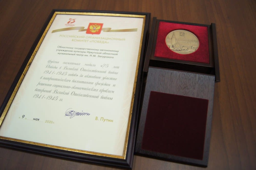 Иркутский областной музыкальный театр им. Н.М. Загурского получил почётную награду российского оргкомитета «Победа» за активное участие в патриотическом воспитании граждан и решении социально-экономических проблем ветеранов Великой Отечественной войны. Диплом за подписью президента России Владимира Путина и памятную медаль директору музтеатра Татьяне Мезенцевой вручил главный федеральный инспектор региона Андрей Абрусевич. Об этом 16 декабря 2020 года сообщает пресс-служба Иркутского областного музыкального театра им. Н.М. Загурского.