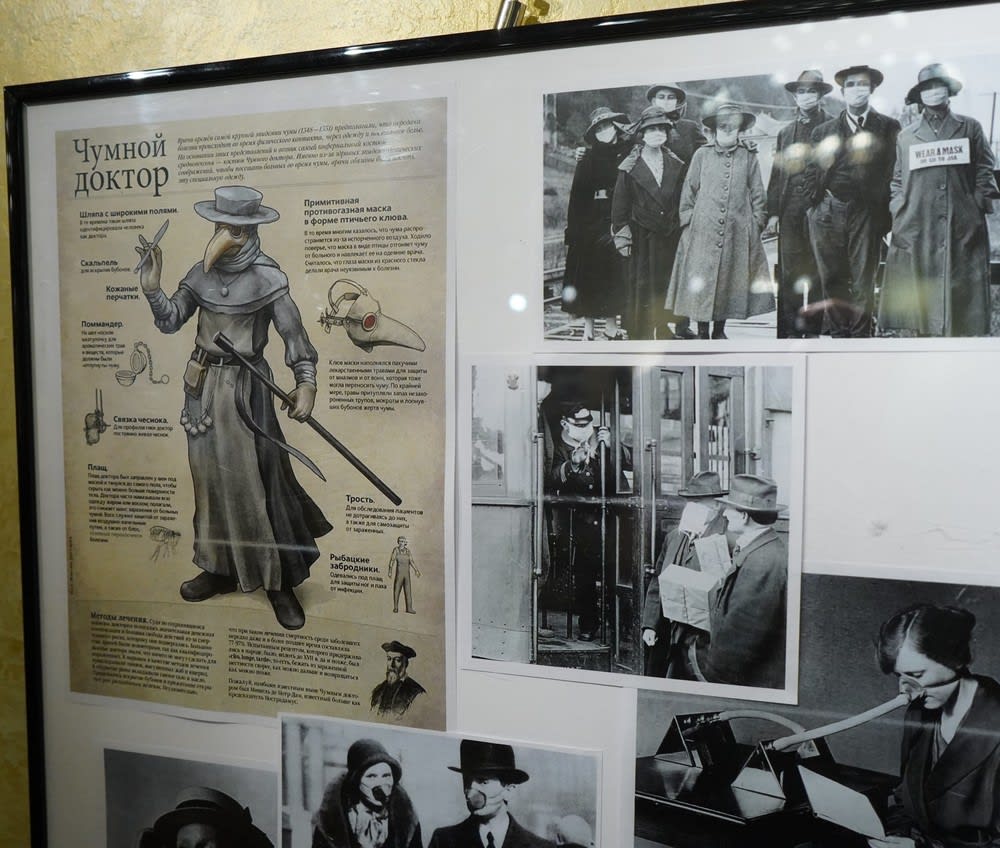 На стенде с «Чумным доктором» плакаты начала XX века рассказывают о том, как спасались люди во время самой массовой эпидемии испанского гриппа, которая была особенно распространена в европейском и североамериканском обществе. Кстати, именно во время «испанки» впервые ввели обязательное ношение марлевых повязок. Интересно, что уже тогда люди проявляли креатив в создании масок. На одном из фото – щеголь XX века, одетый с иголочки: шляпа, костюм, а главное – дизайнерская маска с яркой вышивкой в виде черного черепа. Такие модники были нередким явлением на городских улицах 100 лет назад, как и сейчас, разве что сегодня маску не обязательно шить самому или обращаться к кутюрье. Все можно заказать через интернет.