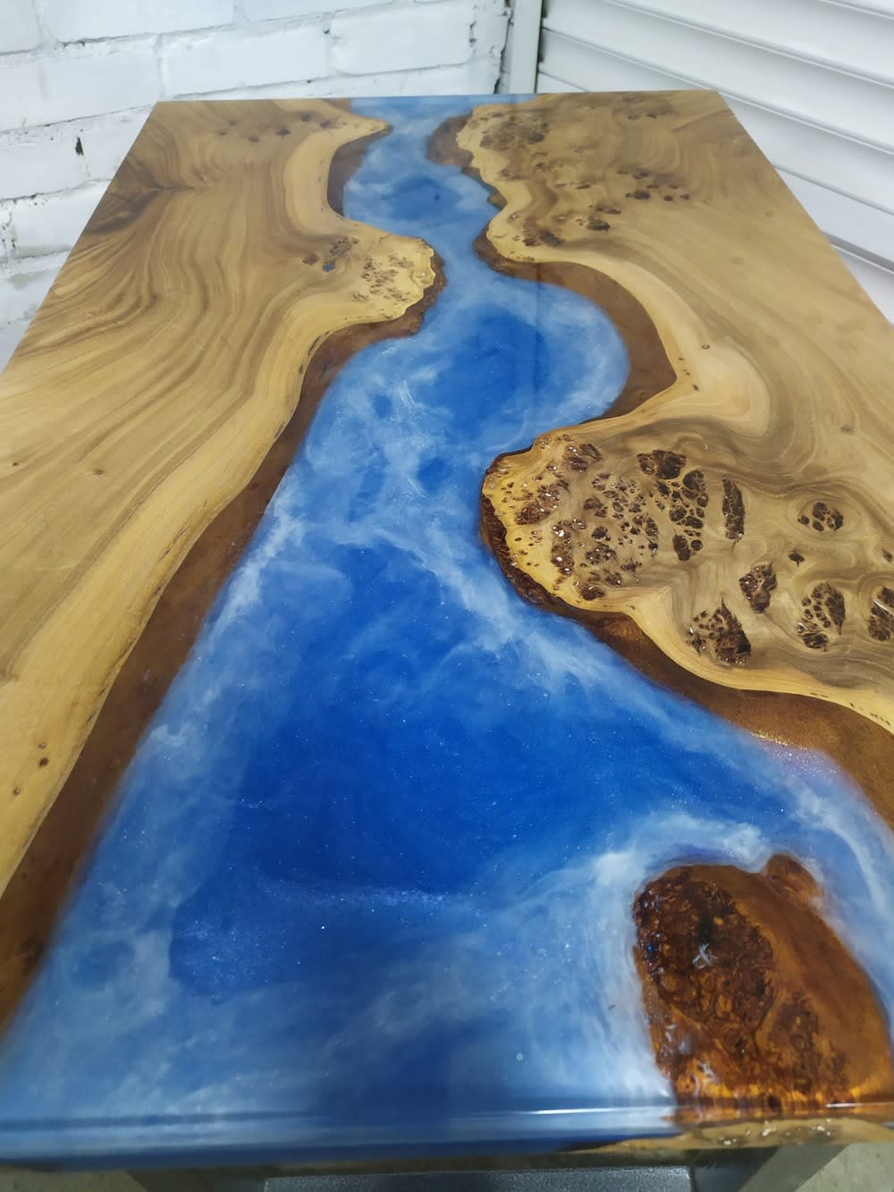 Заливка смолой, пожалуй, самый длительный процесс. Река заливается в два-три слоя или больше, если требуется по толщине. Каждый слой кристаллизуется примерно два дня, уточняет мастер. После полной заливки необходимо, чтобы смола полностью затвердела для дальнейшей обработки. На это уходит обычно три-пять дней.
