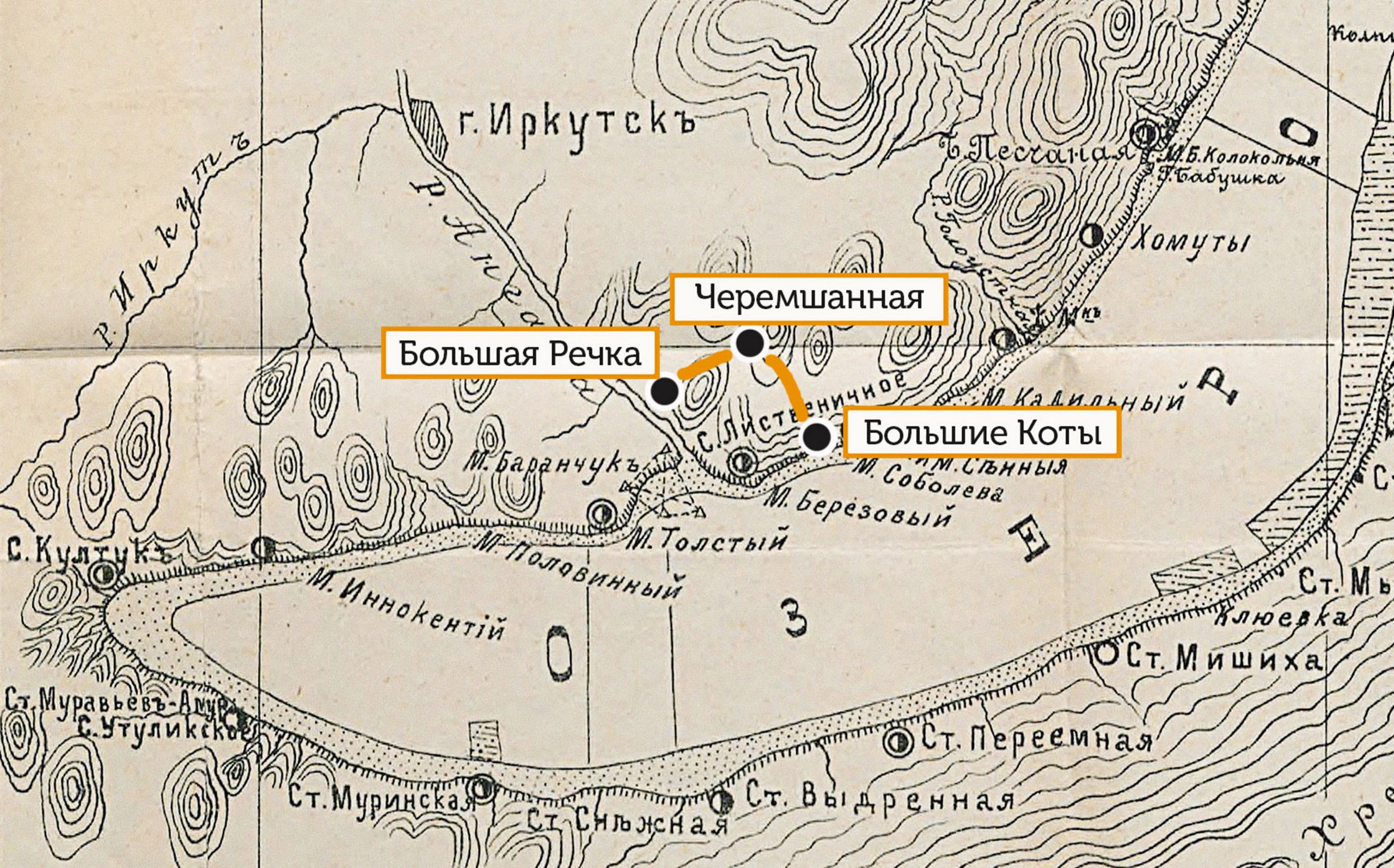 От Иркутска к востоку их путь пролегал по тракту, который сейчас покоится на дне Иркутского водохранилища. От поселка Большая Речка – на север, по дороге вверх по долине Большой Речки, до поселка Черемшанка. Вероятно, там было место ночевки, а на следующий день этап шел до Байкала. Сначала пологий подъем таежной дорогой вверх по пади Черемшаная, потом перевал к Байкалу и удобный спуск к нему. В Больших Котах отдыхали, готовили дрова для тех, кто пройдет этим путем следом за ними, и уходили в длинный переход на восточный берег Байкала, навстречу своей судьбе. По льду шли в кОтах – башмаках на деревянной подошве, изготовление которых стало промыслом жителей прибрежного поселка. Название поселка тоже от этих кОтов, а совсем не от домашних котиков.