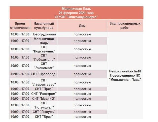 Электроснабжение будет ограничено с 9 до 17 часов 24 февраля 2021 года в некоторых домах поселка Новогрудинина и 19 СНТ по дороге на Мельничную Падь. По сообщению Иркутской электросетевой компании, это связано с проведением ремонтных работ.