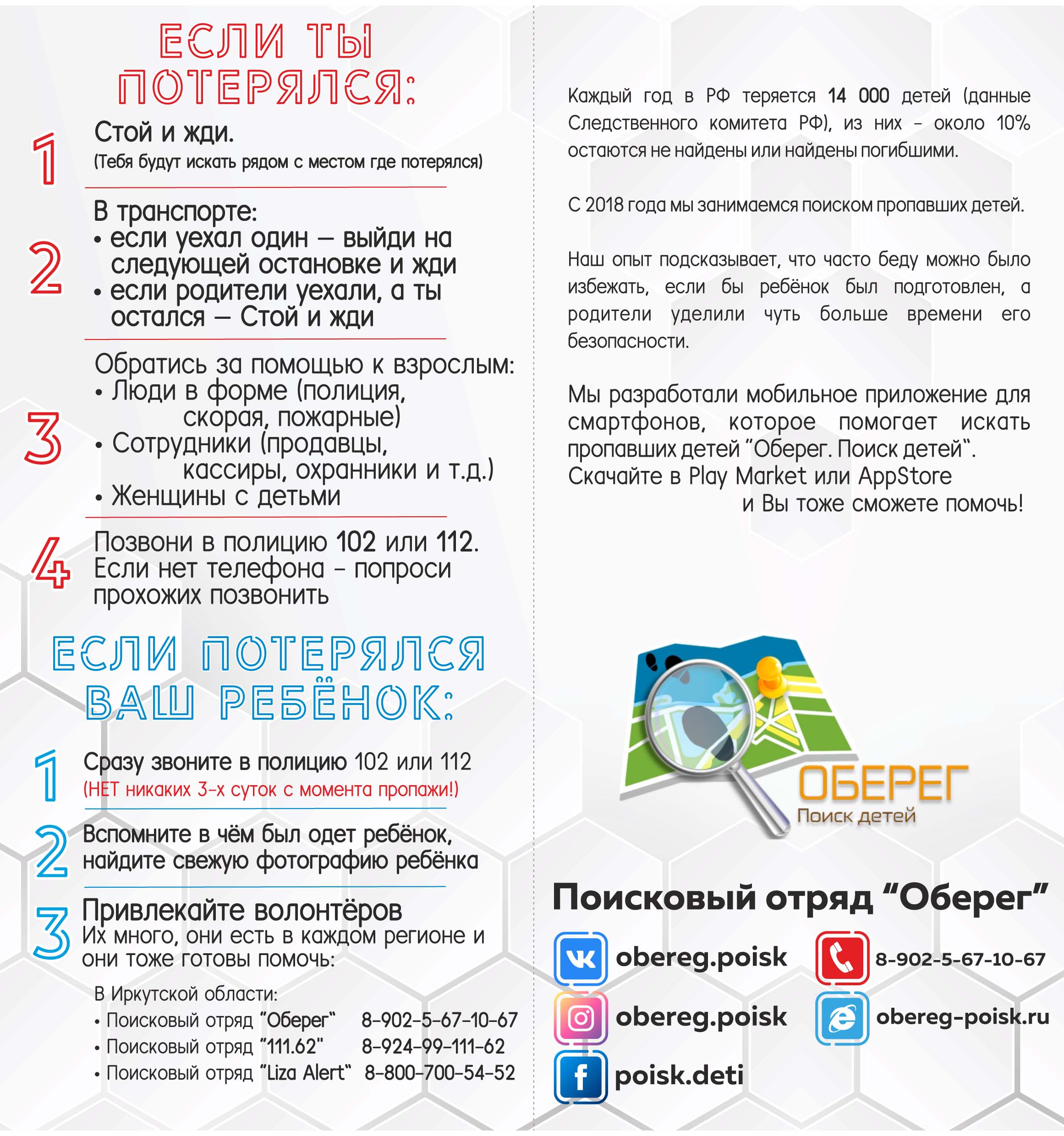 – Важным мы считаем обучение детей безопасному поведению, – продолжает Артем Шестаков. – Проводим лекции-тренинги в школах, детских домах и детсадах, рассказываем, как не потеряться, что делать, если уже потерялся, как защититься от похитителя. Учим детей кричать, оказывается, они не умеют этого делать, учим за все цепляться, привлекать внимание в случае опасности. Уже обучили 1,5–2 тысячи ребятишек из Иркутска, Шелехова, Усолья-Сибирского.