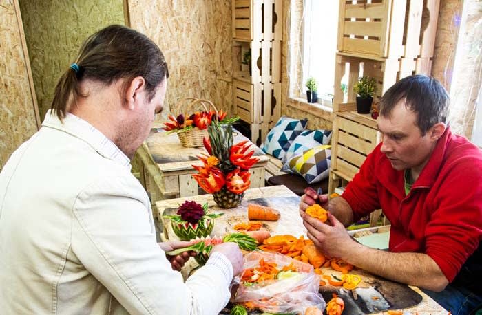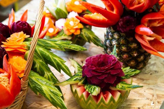Привычные всем продукты чудесным образом превратились в прекрасные жарки, пионы, розы, лилии и тюльпаны.