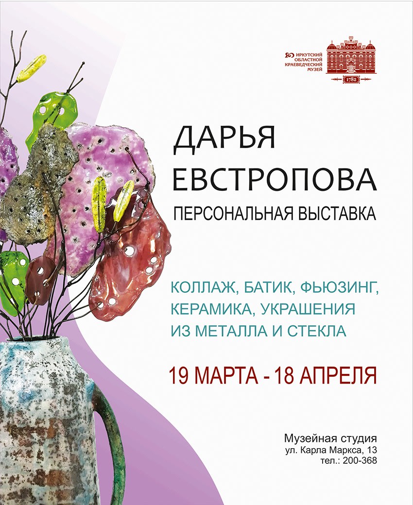 В выставочном отделе «Музейная студия» Иркутского краеведческого музея 19 марта 2021 года в 16:00 часов откроется персональная выставка иркутского художника Дарьи Евстроповой. Посетители увидят работы в техниках фьюзинг (плавленое стекло), батик, коллаж, произведения из керамики, а также украшения из металла и стекла. Об этом 18 марта сообщает пресс-служба Иркутского областного краеведческого музея.