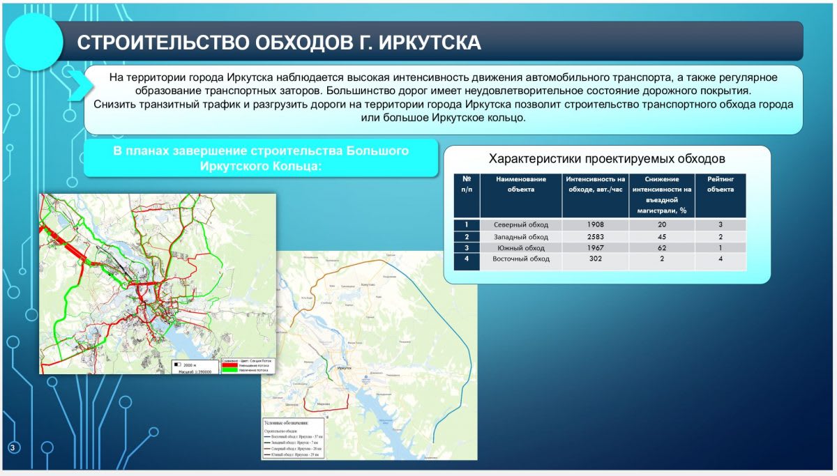 Построить обход для увеличения дорожных потоков Иркутска предложил губернатор Иркутской области Игорь Кобзев. Министерство транспорта России подтвердило финансирование строительства единого транспортного кольца в Иркутске.